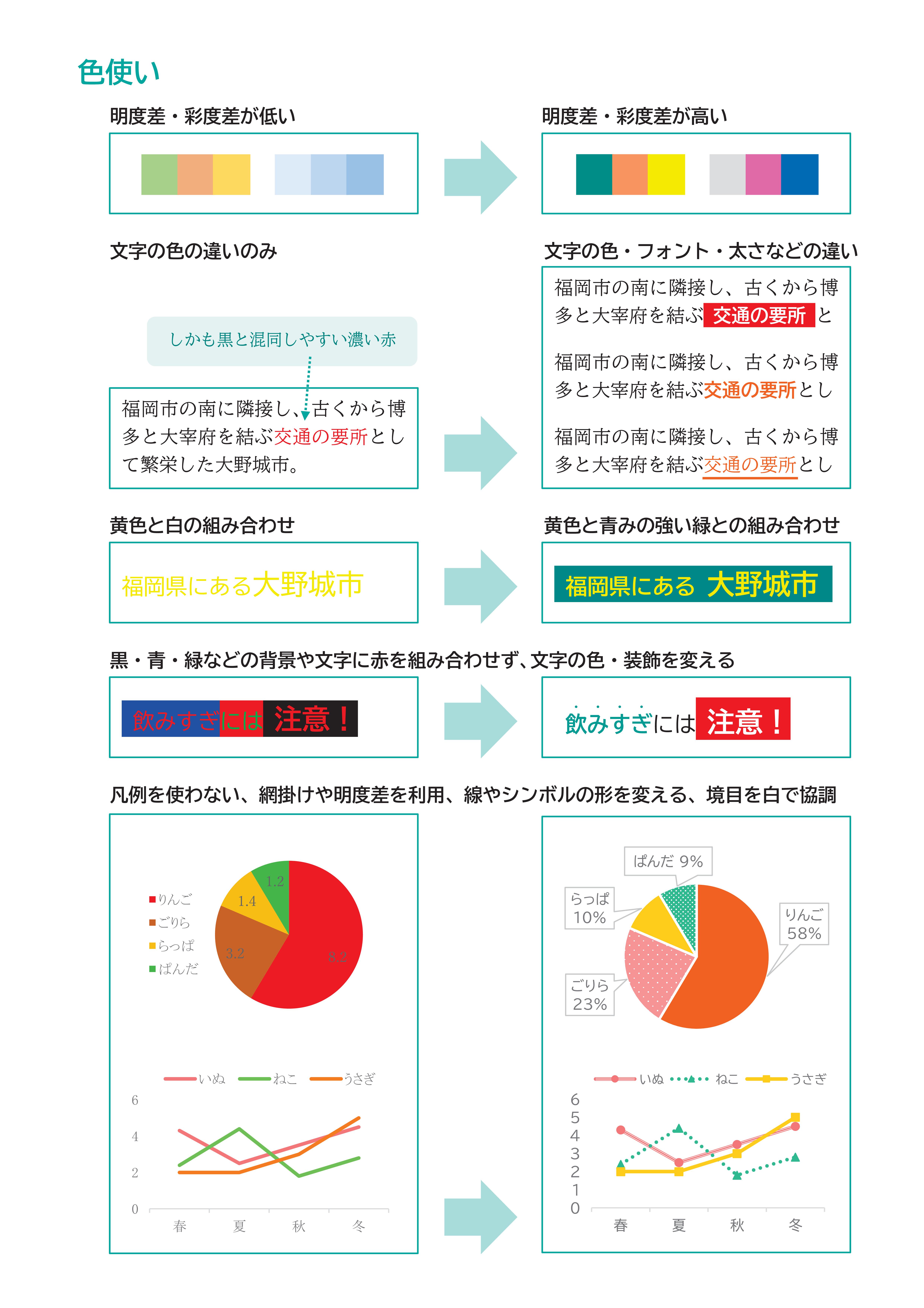 - 緑は青みの強い緑を使う(暗い緑は赤や茶色と、黄緑は黄色と混同しやすい)